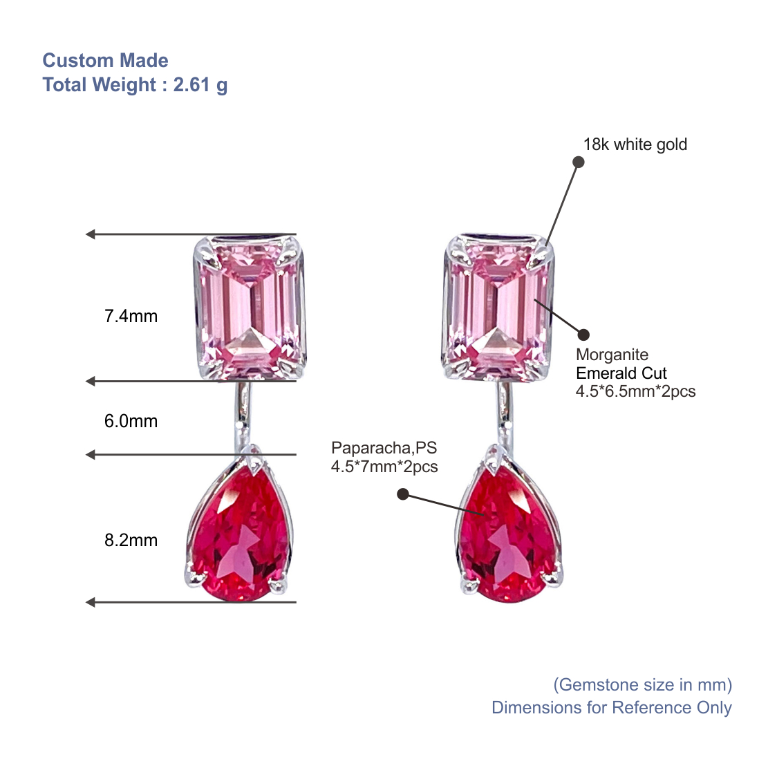Discover the perfect harmony of sunset hues with our Morganite and Padparadscha Sapphire Drop Earrings. These custom-made treasures feature an exquisite pairing of soft pink emerald-cut Morganites and vibrant, fiery pear-shaped Padparadscha sapphires. Crafted in sleek 18K white gold, these earrings offer a sophisticated vertical drop that elongates the neck and captures the light with every movement. Whether for a red-carpet event or a romantic evening, these dangles are a testament to refined artistry and rare gemstone beauty.