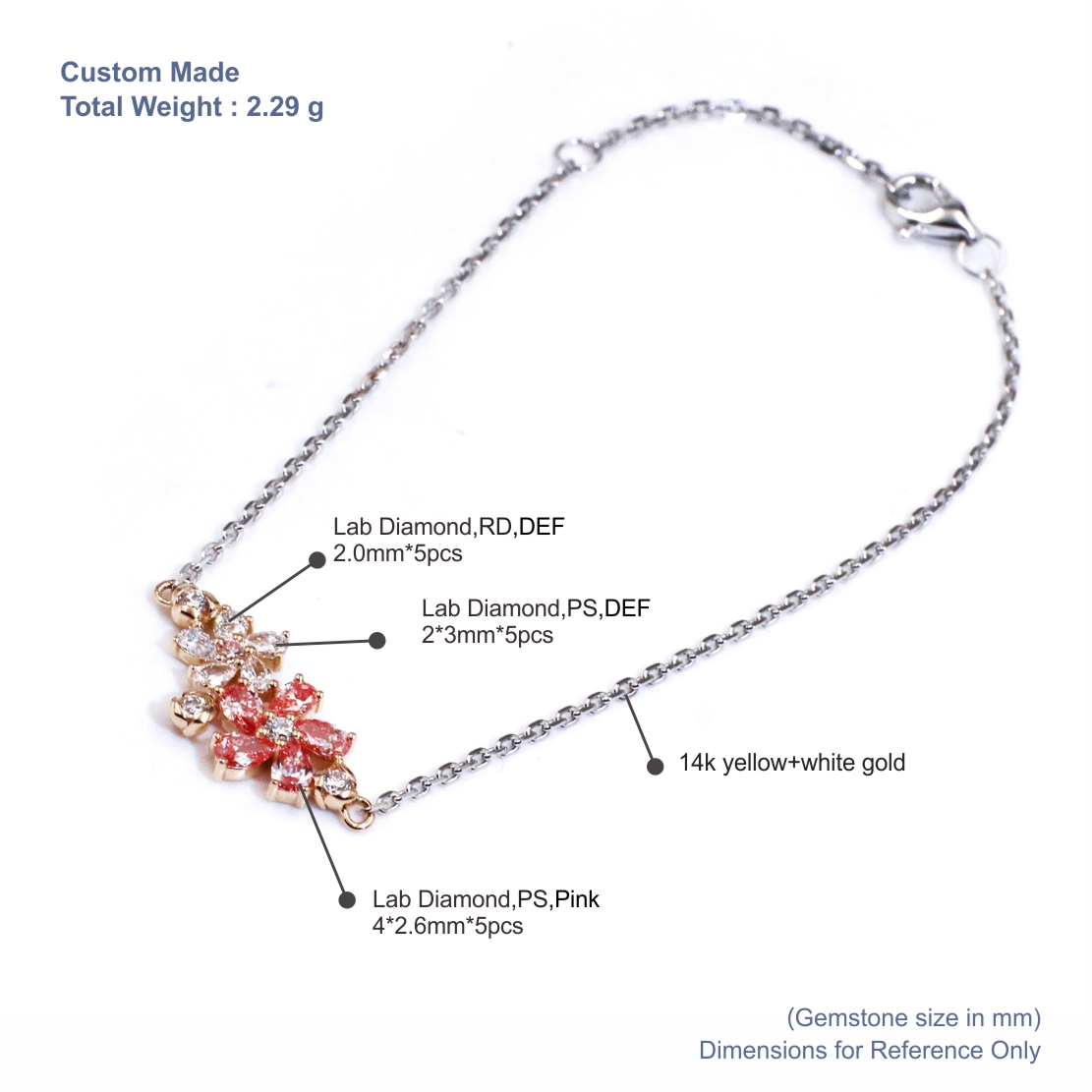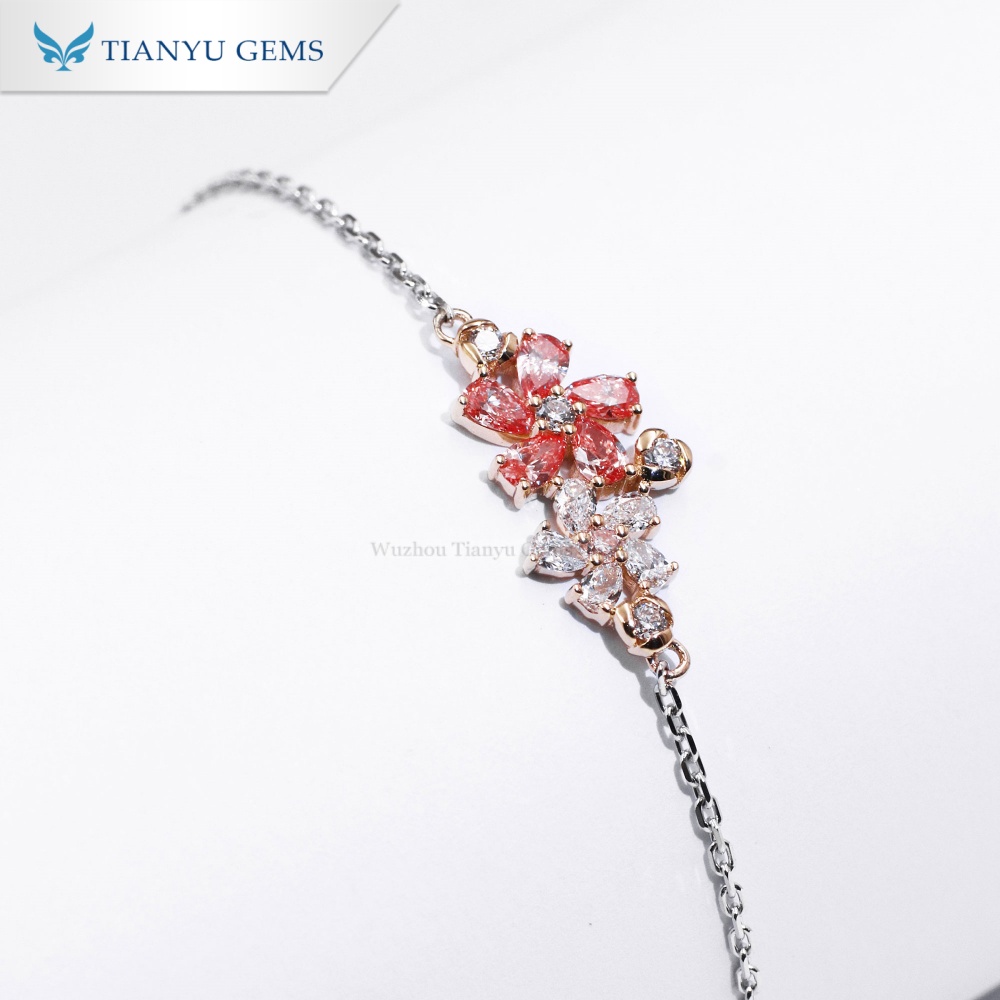 سوار أنيق مرصع بزهرة من الألماس المصنّع في المختبر، مصنوع من الذهب الأصفر والأبيض عيار 14 قيراطًا، يتميز بتصميم زهري رقيق مرصع بألماس أبيض ووردي على شكل كمثرى. مصمم خصيصًا للعلامات التجارية وتجار التجزئة وتجار الجملة الذين يبحثون عن مجوهرات فاخرة عالية الجودة مصممة حسب الطلب مع مرونة في الإنتاج وفقًا لمواصفات OEM/ODM.
