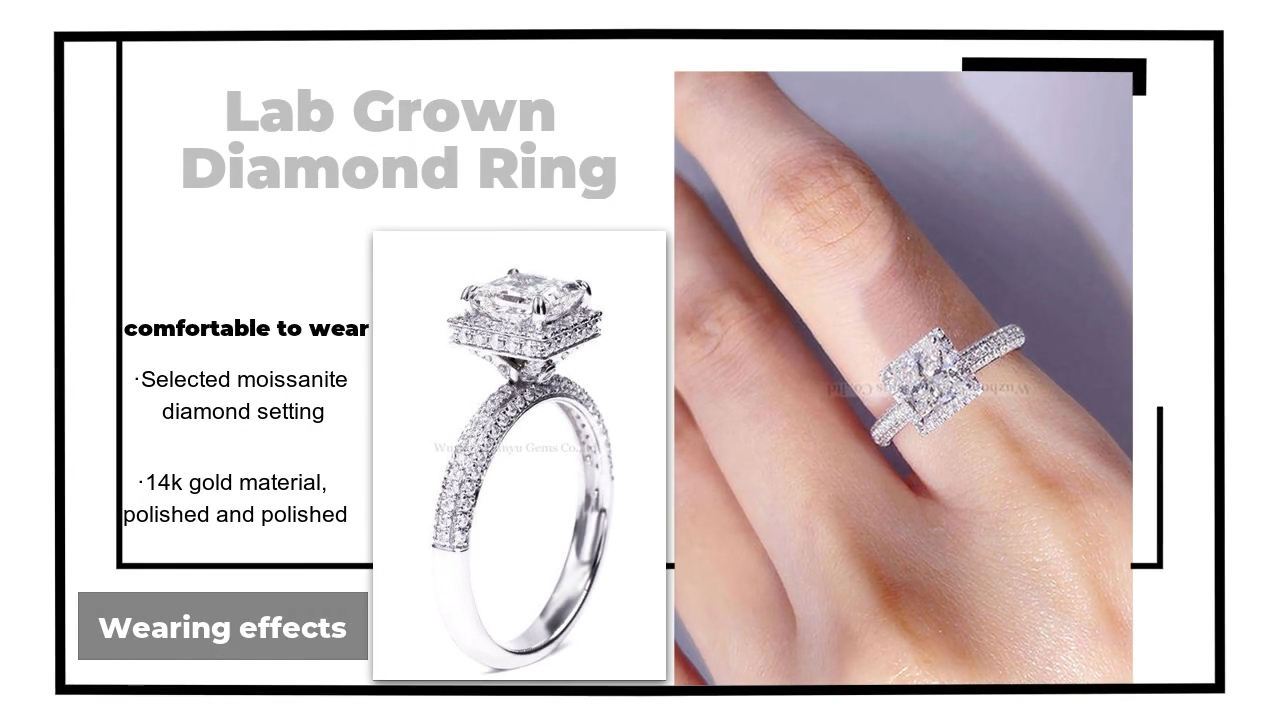 تم وضع ما مجموعه 128 مويسانيتي حول الحجر الرئيسي ، والذي يضيء أكثر ضد الحجر الرئيسي ؛ بينما يتم تعيين الماس المزروع بقطع الأميرة بوزن 1.30 قيراط على عرض معين للذراع الحلقي من أجل الملمس والهالة ؛ تزن الحلقة كاملة 3.41 جرام