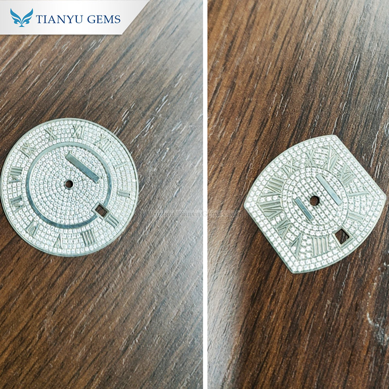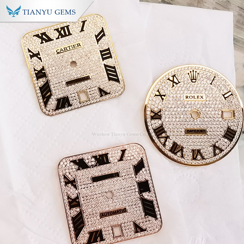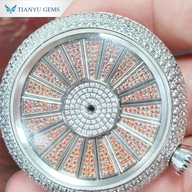 تقدم Tianyu Gems Design قرص ساعة مرصع بألماس موسانيت دائري؛ يعكس بريقًا قزحيًا يفوق الماس العادي؛ وهو إكسسوار فاخر مثالي للتنقل اليومي.