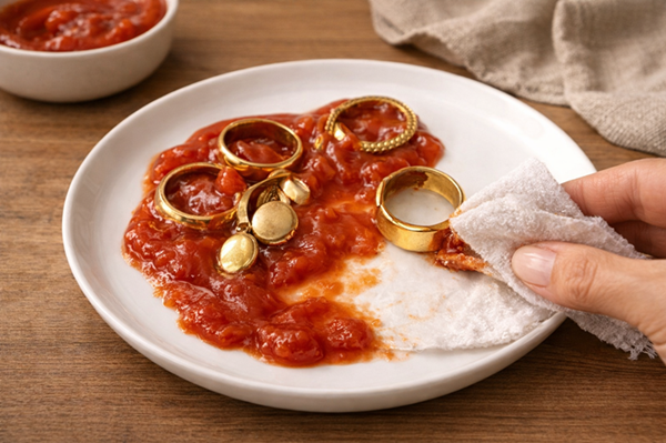 Pro tip: Use plain ketchup whenever possible. Avoid varieties with added spices such as chili or black pepper, which may scratch the jewelry or leave corrosive residue.