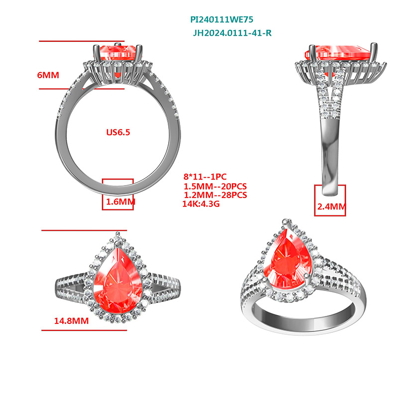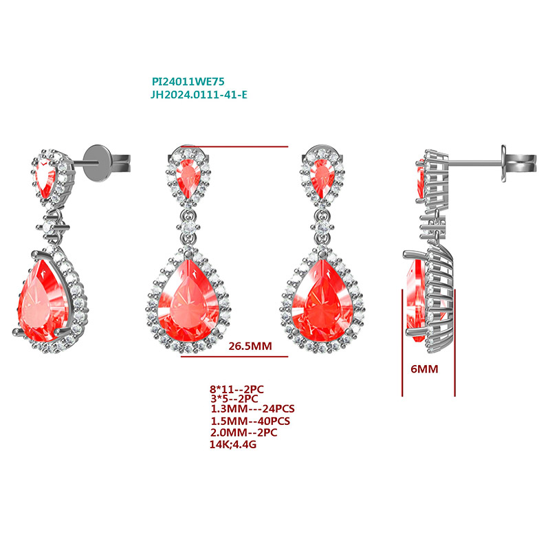 Ce coffret sophistiqué pour elle comprend un collier, des boucles d'oreilles et une bague assortis en or jaune classique 14 carats. Chaque pièce présente un rubis taille poire créé en laboratoire élégamment encadré de moissanite blanche. Le pendentif est suspendu à une chaîne câblée de 16 pouces qui se ferme avec un fermoir mousqueton et les boucles d'oreilles sont sécurisées avec des fermoirs à friction. La bague est disponible uniquement en taille standard US6,5.