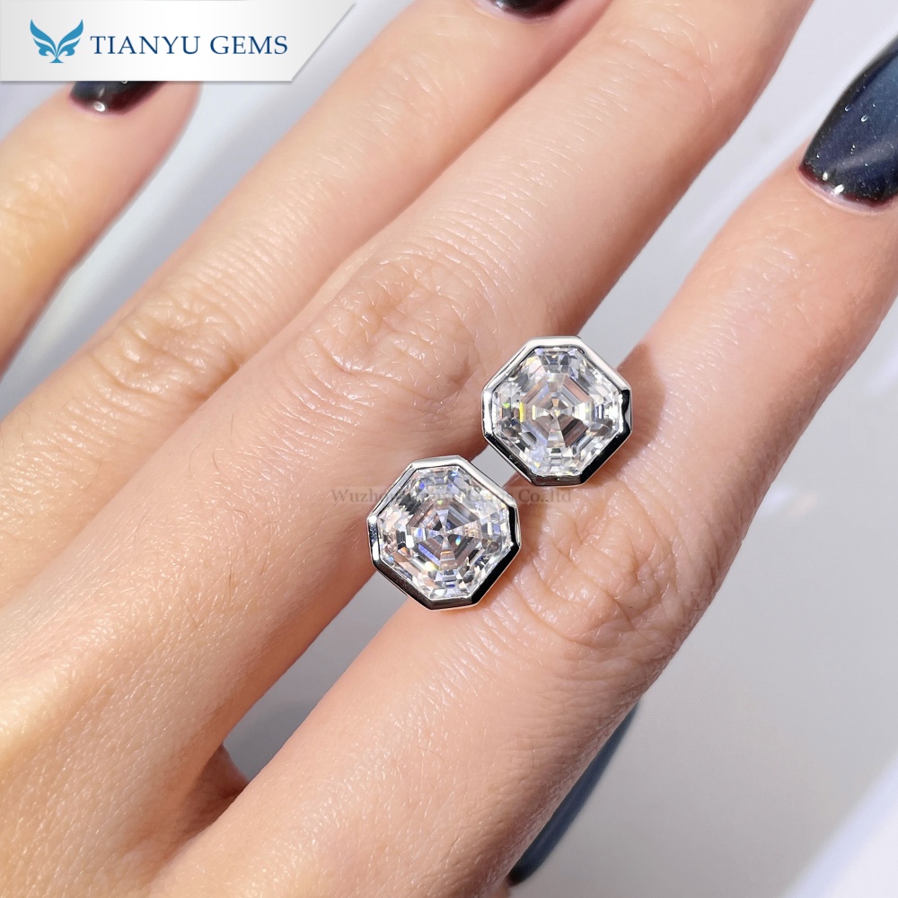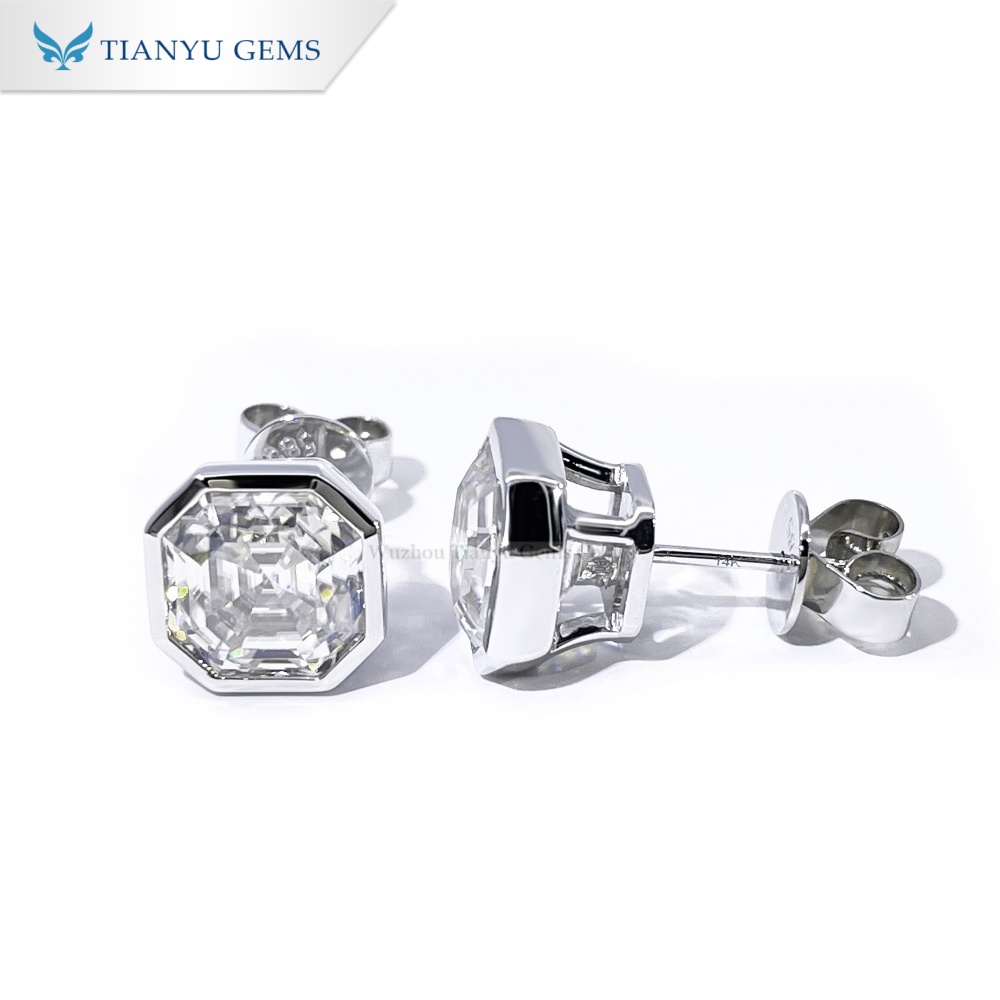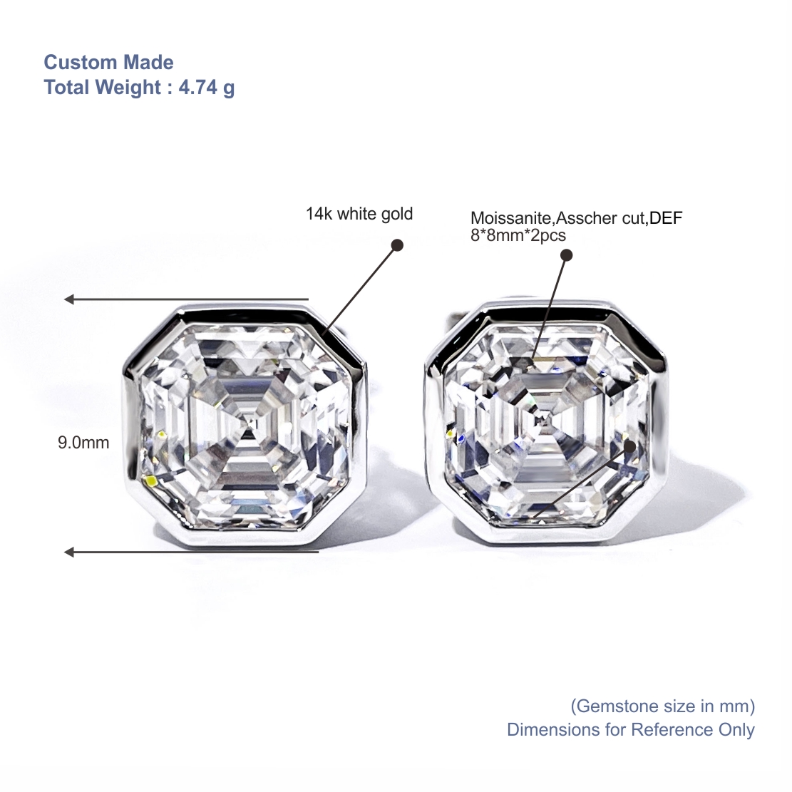 Scopri la bellezza architettonica degli orecchini a bottone con moissanite taglio Asscher. Questi orecchini personalizzati presentano due imponenti moissaniti taglio Asscher da 8x8 mm, per un totale di circa 4,74 g, in oro bianco massiccio 14 carati. Incastonate in un'elegante montatura a castone che ne accentua l'effetto vintage "sala degli specchi", queste pietre incolori DEF offrono una brillantezza sofisticata e discreta per gli amanti dei gioielli più esigenti.