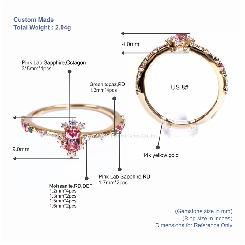 이 핑크 사파이어 반지는 핑크 원석을 메인 스톤으로 하고 모이사나이트 다이아몬드와 그린 토파즈를 사용하여 일상적인 착용에 적합할 뿐만 아니라 가장 아끼는 사람을 위한 특별한 선물로도 좋습니다.