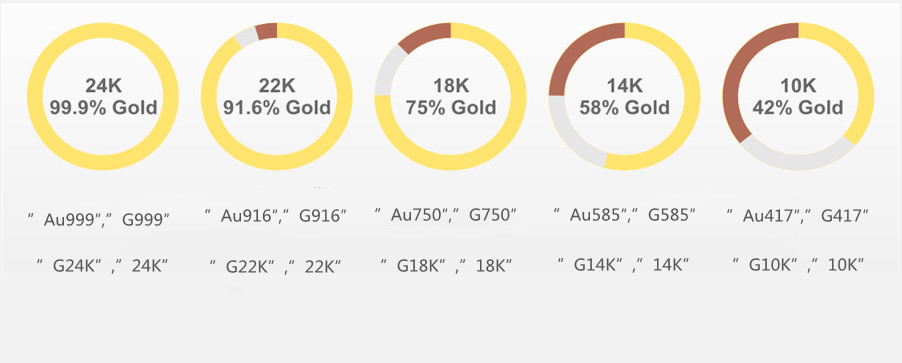 You will often find marks denoting the karat weight when it comes to gold jewelry. The karat system measures the purity of gold, which is represented by a number followed by the letter "K." For example, 24K gold is considered pure gold, while 18K gold contains 75% gold and 25% other metals. The lower the karat weight, the lesser the gold content. It's important to note that 24K gold is relatively soft and unsuitable for certain types of jewelry requiring durability.