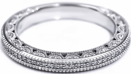 Edwardiaanse bands roepen de gratie en verfijning van het begin van de 20e eeuw op, geïnspireerd door de regering van koning Edward VII. Ze zijn voornamelijk gemaakt van platina en versierd met ingewikkelde filigraan- en milgrain-details en stralen tijdloze elegantie uit. Met delicate kantachtige patronen en op de natuur geïnspireerde motieven, zoals bloemen en bladeren, symboliseren Edwardiaanse banden romantiek en vrouwelijkheid. Deze bands zijn perfect voor bruiden die op zoek zijn naar een mix van vintage charme en tijdloze verfijning. Ze bieden een knipoog naar de geschiedenis en vullen moderne bruidsstijlen aan met hun tijdloze schoonheid en sierlijke allure.