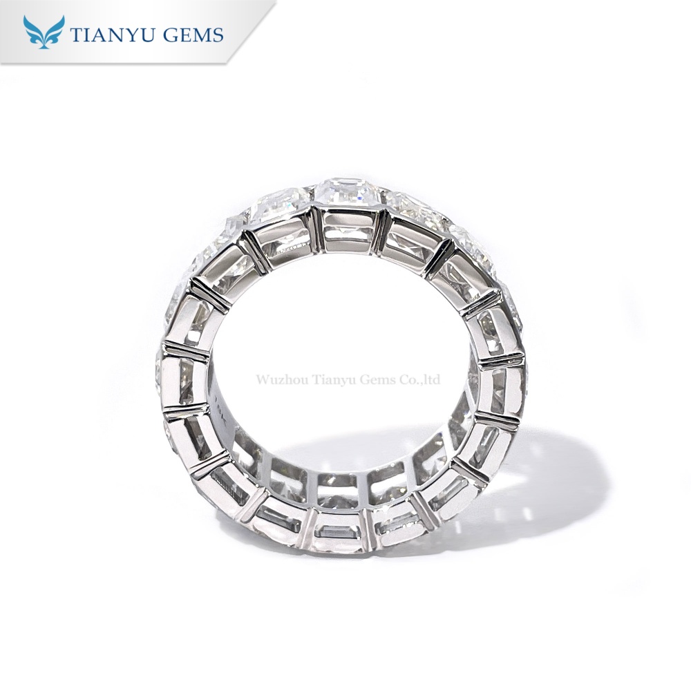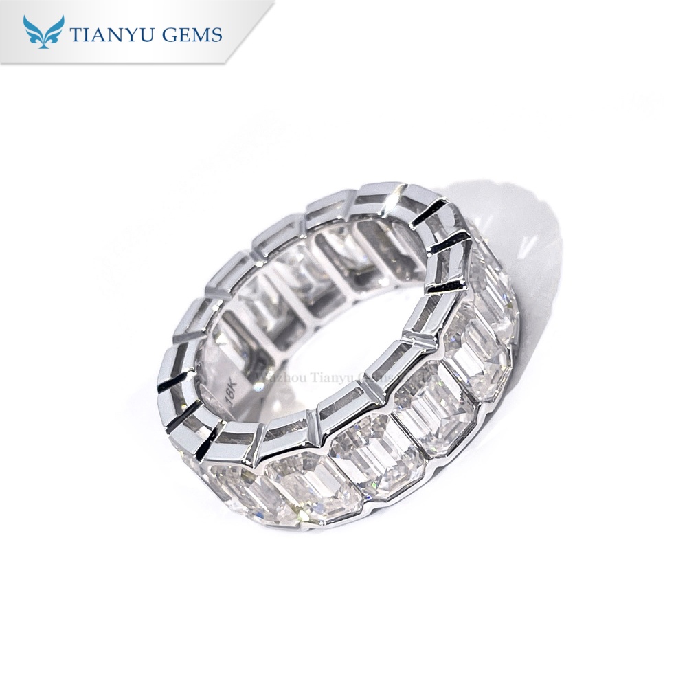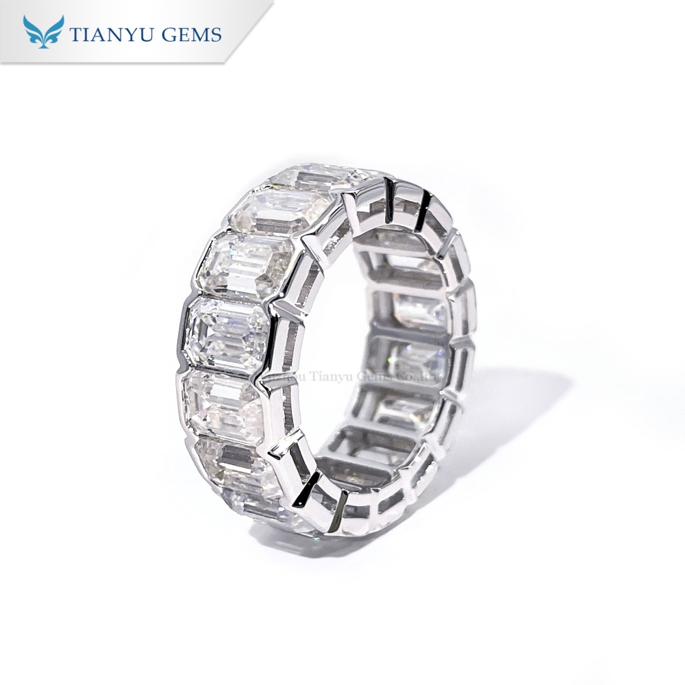 Denne evighetsringen i moissanitt har en kontinuerlig sirkel av smaragdslipte moissanittsteiner, som symboliserer evig kjærlighet og forpliktelse. Hver stein er håndsatt for å sikre perfekt justering, skarpe fasetter og en sømløs visuell flyt.