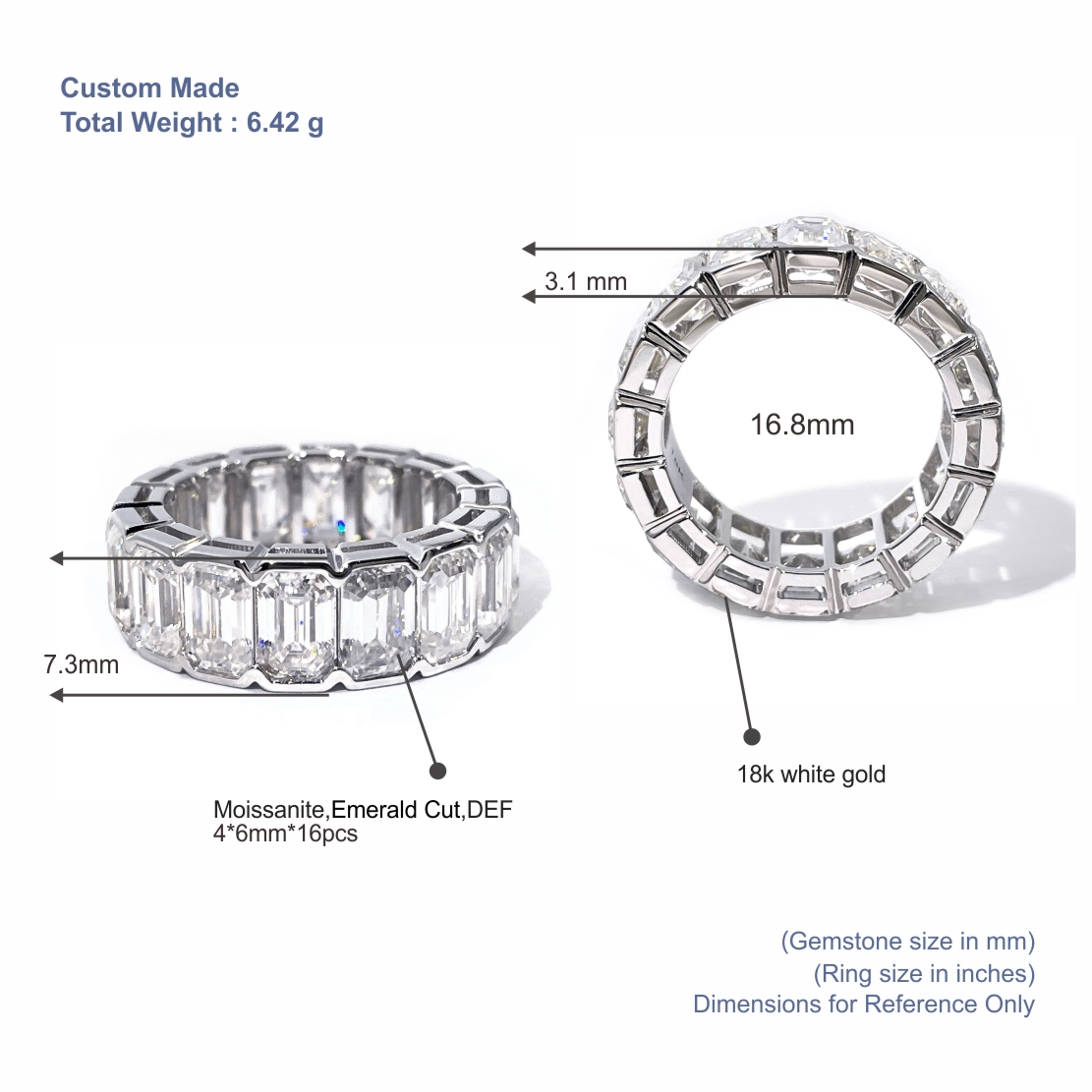 Opplev toppen av sofistikert luksus med vår Emerald Cut Moissanite Eternity Band. Dette spesiallagde mesterverket er designet for de som søker et tidløst symbol på uendelig forpliktelse. Håndlaget i massivt 18 karat hvitt gull, har ringen en kontinuerlig, fantastisk rekke med 16 smaragdslipte moissanitter, hver satt i en moderne bezel. Med sin betydelige bredde på 7,3 mm og upåklagelige DEF-fargeløse steiner, er denne ringen et dristig uttrykk for eleganse som fanger lyset fra alle vinkler.