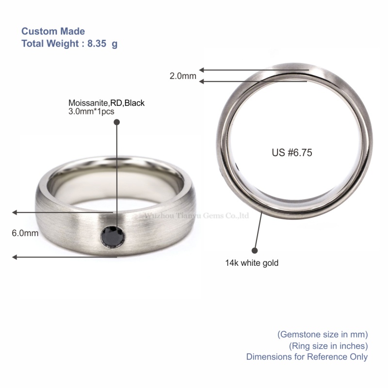 Denne ringen har en enkelt svart moissanittdiamant besatt i 14 karat hvitt gull. Den er ikke bare rimelig i pris, men den beholder også den luksuriøse følelsen og verdien av edle metaller sammen med den strålende gnisten fra moissanitten – noe som gjør den til et problemfritt valg for hverdagsbruk.