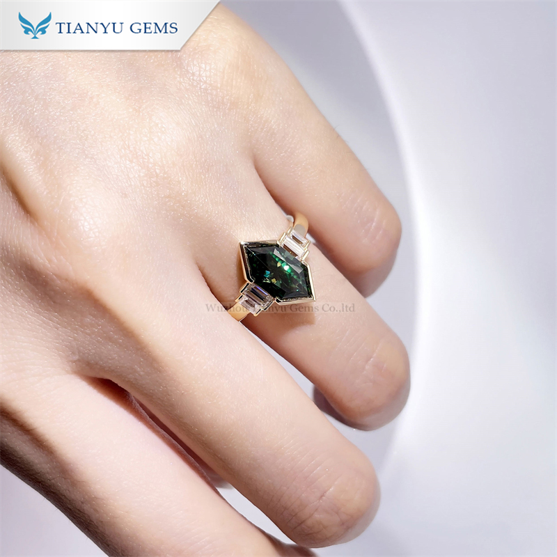 The green moissanite ring features a brilliant, vibrant green moissanite gemstone. Moissanite is a naturally occurring mineral that is known for its exceptional clarity and brilliance, making it an ideal alternative to traditional diamonds. Not only is moissanite more affordable than diamonds, but it is also more durable and resistant to scratches and chips, making it an excellent choice for everyday wear. The green moissanite engagement ring offers both style and peace of mind for those looking for an environmentally conscious and budget-friendly option in fine jewelry. This Dutch marquise cut diamond green moissanite engagement ring women's ring in yellow gold is fashionable and versatile, 18k gold high precision fine polishing, also can choose 10k/14k gold production and wholesale.