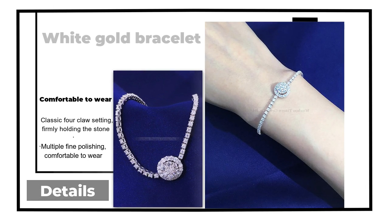 Details.Comfortable to wear.· Classic four claw setting, .firmly holding the stone.··Multiple fine polishing, .comfortable to wear.White gold bracelet.