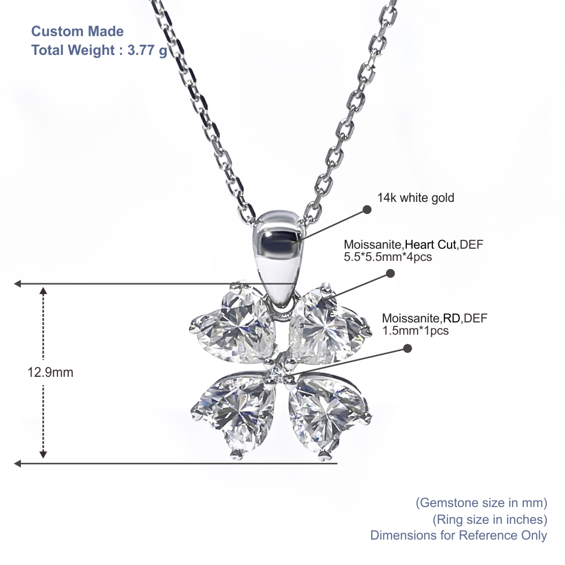 Leve consigo um toque de sorte e amor eterno com o nosso Colar de Trevo de Quatro Folhas em Moissanita. Confeccionado em ouro branco polido 14K, este pingente exclusivo apresenta quatro requintadas pedras de moissanita com lapidação em coração que formam um trevo brilhante. Com um peso total de 3,77g e uma classificação DEF incolor impecável, este colar é um luxo sofisticado para o dia a dia ou um presente significativo para alguém especial.