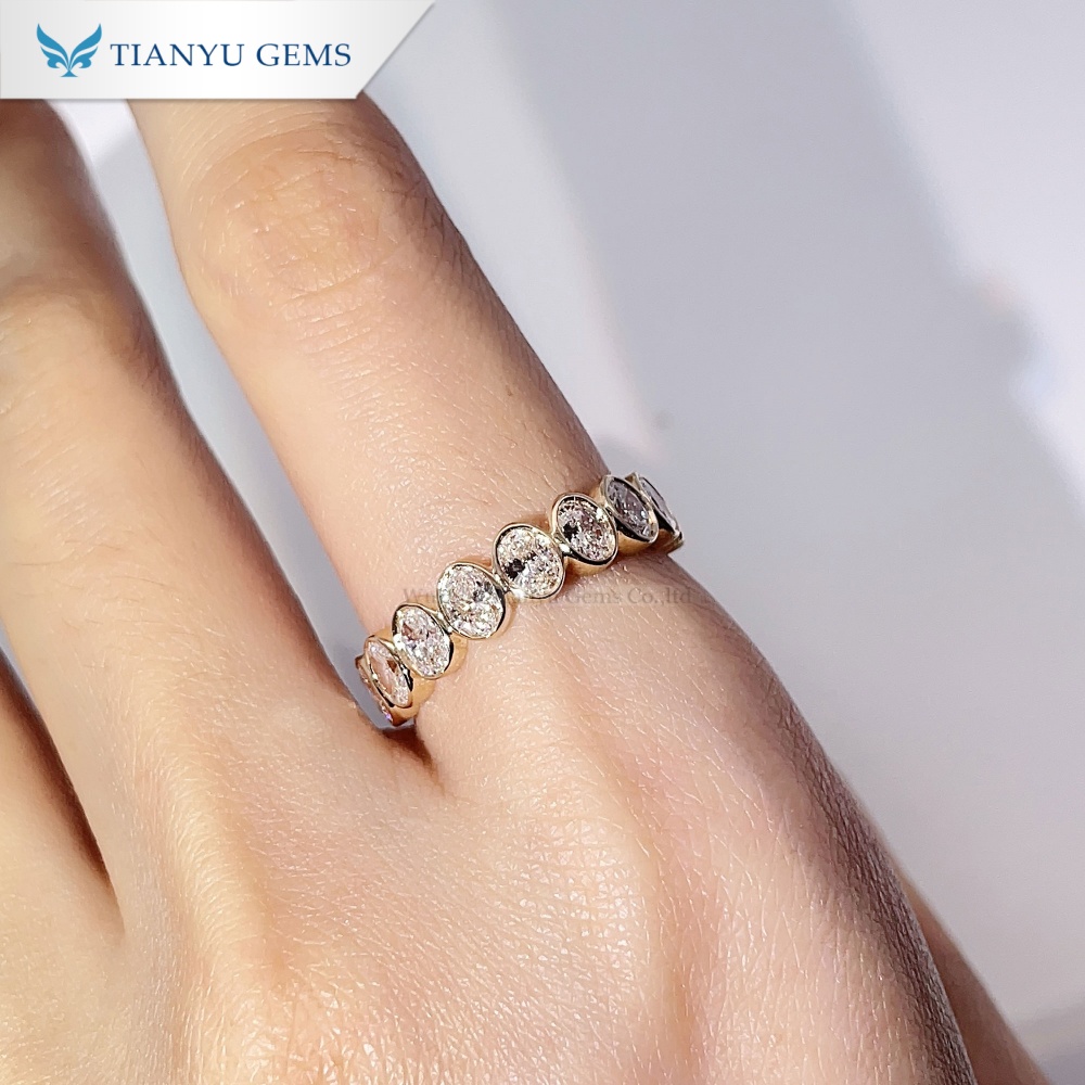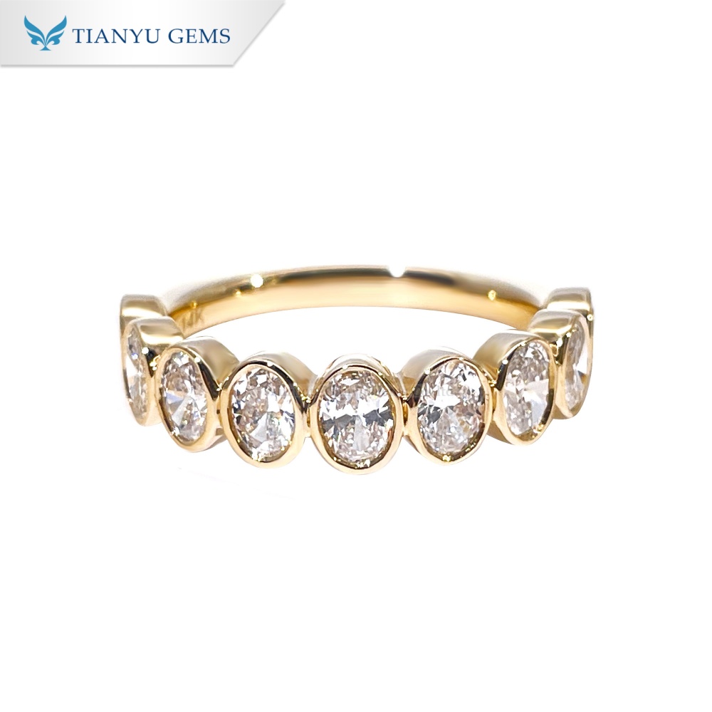 Elegante, moderno e concebido para o luxo do dia a dia, este anel de meia aliança com diamantes de laboratório de lapidação oval é feito à mão em ouro amarelo maciço de 14 quilates. Com uma cravação refinada em bisel e diamantes de laboratório de cor DEF, este anel oferece brilho excepcional, conforto e flexibilidade de personalização para marcas de joias, varejistas e marcas próprias.