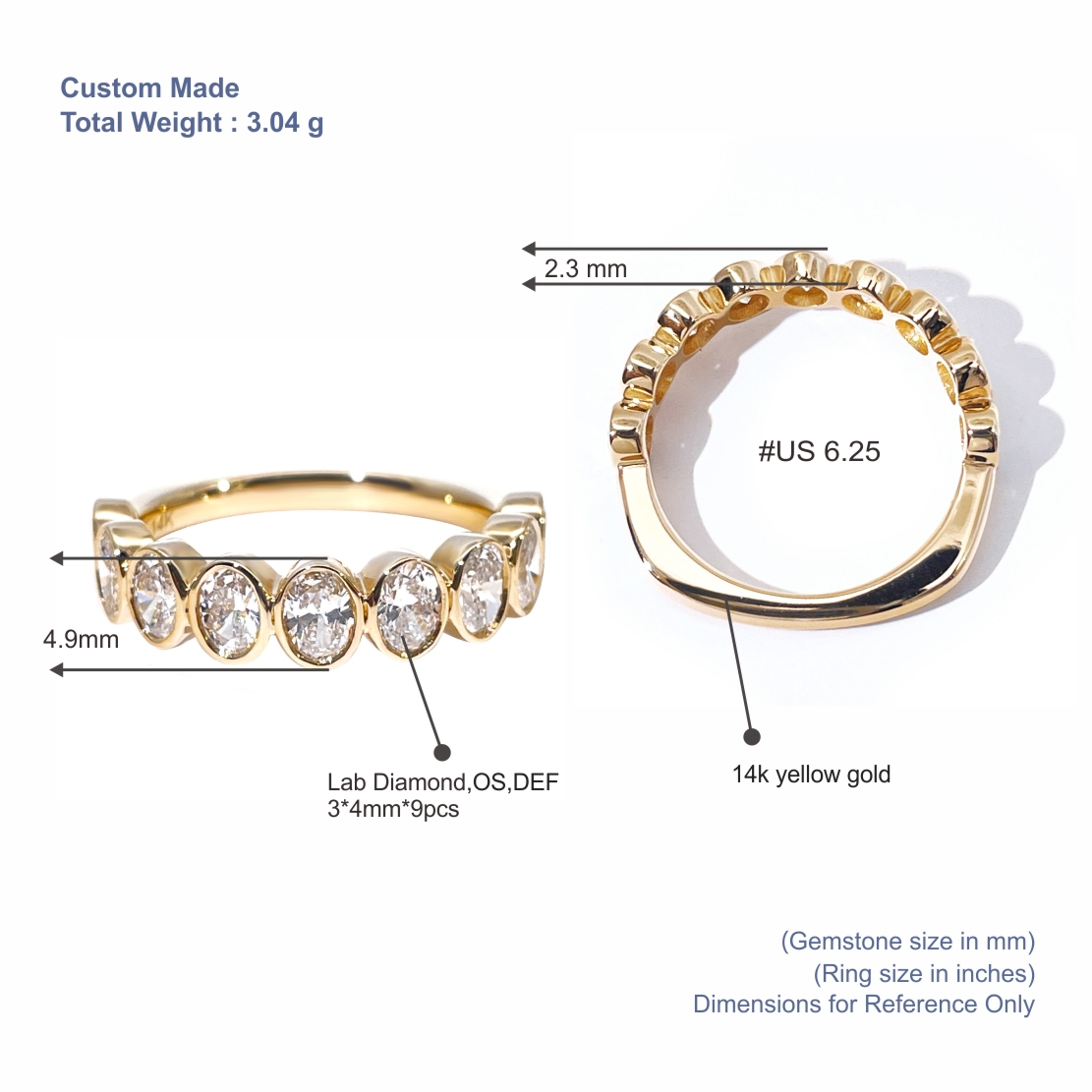 Este anel de meia aliança com diamantes exibe 9 diamantes ovais cultivados em laboratório (3×4 mm cada), cuidadosamente engastados em bisel para criar uma silhueta suave e contemporânea. O engaste em bisel aumenta a durabilidade e realça o brilho alongado das pedras ovais, tornando-o ideal para uso diário, para combinar com outros anéis ou para compor coleções de alianças de casamento.