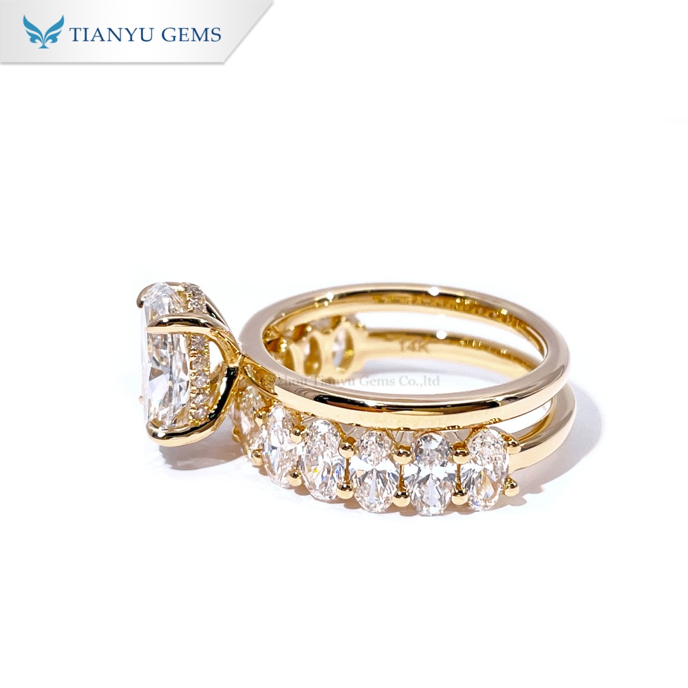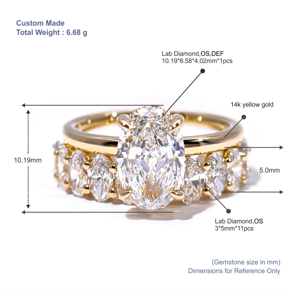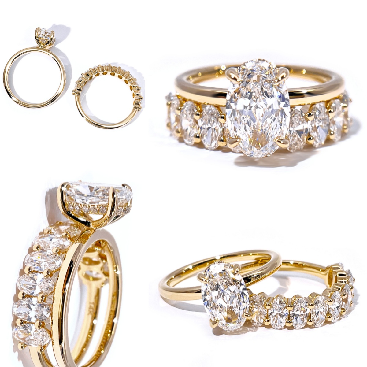 Em comparação com os tradicionais cortes redondos ou quadrados, os diamantes ovais fazem os ponteiros parecerem mais longos. Combinados com ouro 14K, o design geral tem um toque vintage e sofisticação moderna.