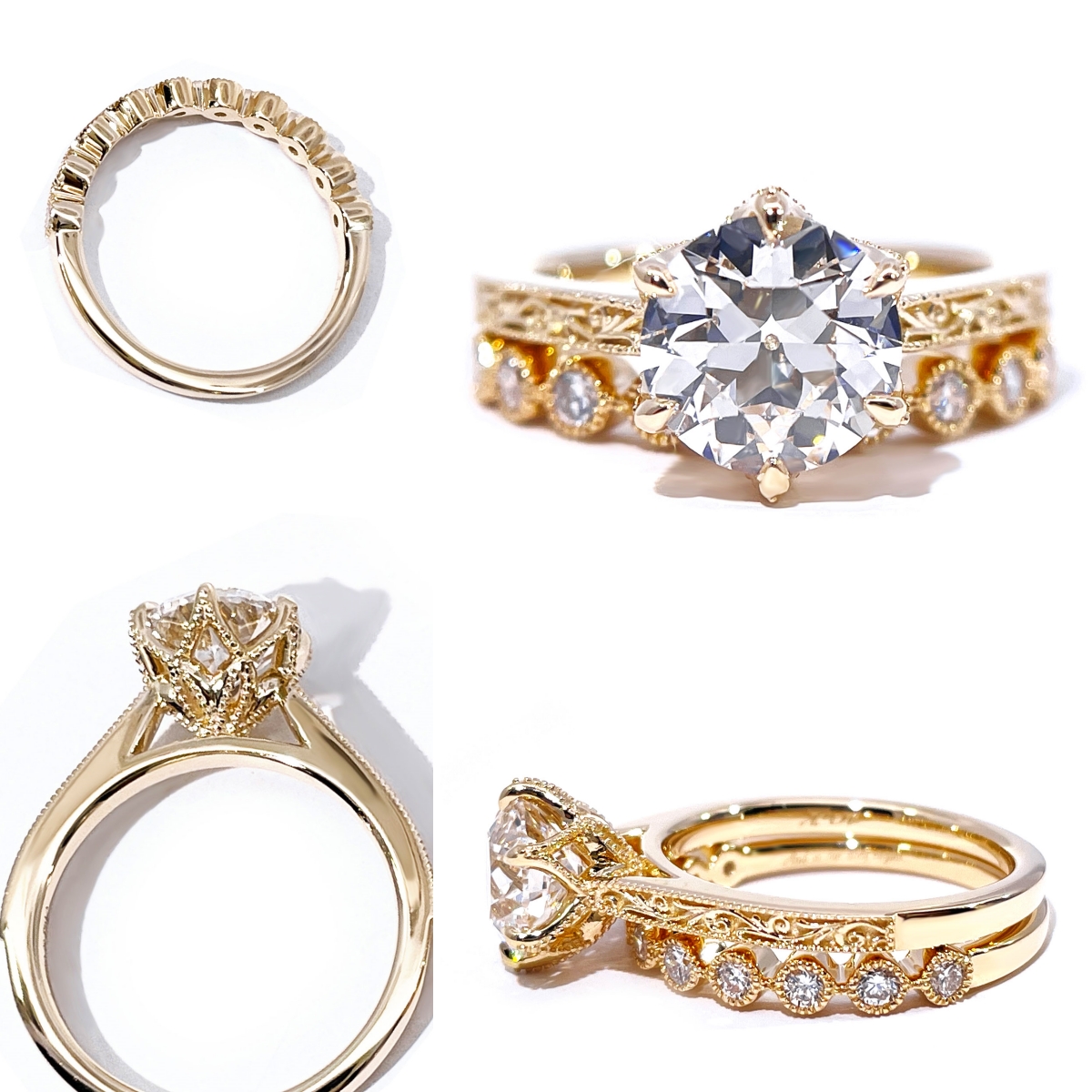 Conjunto de anéis com pedra central redonda e encorpada, padrões delicados serpenteando ao longo da haste, acentuados com pedras peroladas nas laterais. Cada diamante de laboratório é cuidadosamente selecionado e polido para uso confortável.