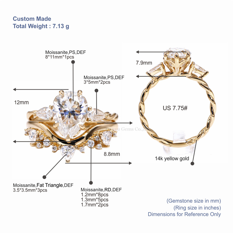 Este conjunto de anéis de coroa de moissanita em ouro amarelo 14K apresenta um formato de coroa clássico, simbolizando a dignidade e a santidade do amor. Os diamantes de moissanita incrustados na coroa brilham intensamente como se fossem os momentos mais brilhantes de amor. O ouro amarelo 14K não é apenas resistente ao desgaste e durável, mas também possui boas propriedades antioxidantes, que podem manter seu brilho por muito tempo. Este design reflete a elegância da estética tradicional e incorpora a inovação do design moderno, tornando cada anel único.