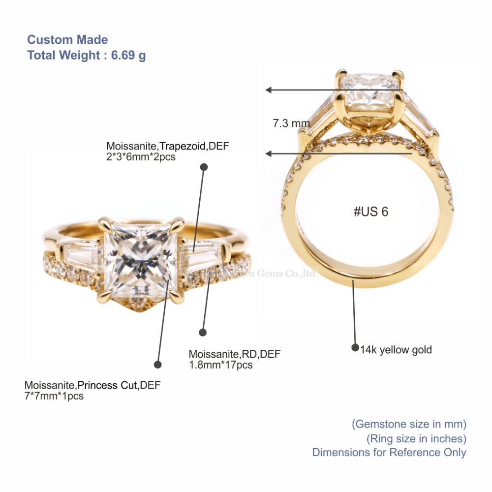 Uma combinação de ouro 14K e diamantes moissanita pode parecer comum, mas é tão deslumbrante quanto diamantes verdadeiros. É acessível e oferece ótima relação custo-benefício. O anel principal apresenta uma cravação de três pedras, simbolizando o romance.
