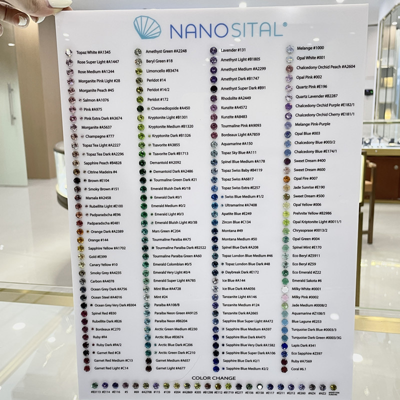 Nanostial kan tillverkas i olika färger, såsom röd, blå, rosa, gul, grön, lila och till och med färglös (vit). Det är ett utmärkt alternativ till naturligt färgade ädelstenar. Det finns i 176 färger (152 standardfärger och 24 färgskiftande färger) och är färgstabilt vid uppvärmning. Det kan vanligtvis gjutas i förlorat vax.