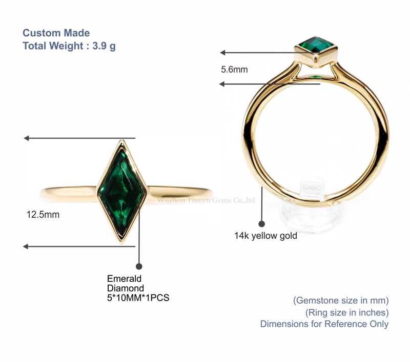 14k gult guld diamantformad smaragdring, huvudstenen är 5 x 10 mm pastillslipad smaragd, med gult guldarm ser vintage och elegant ut, det är en fashionabel pjäs för alla tillfällen.