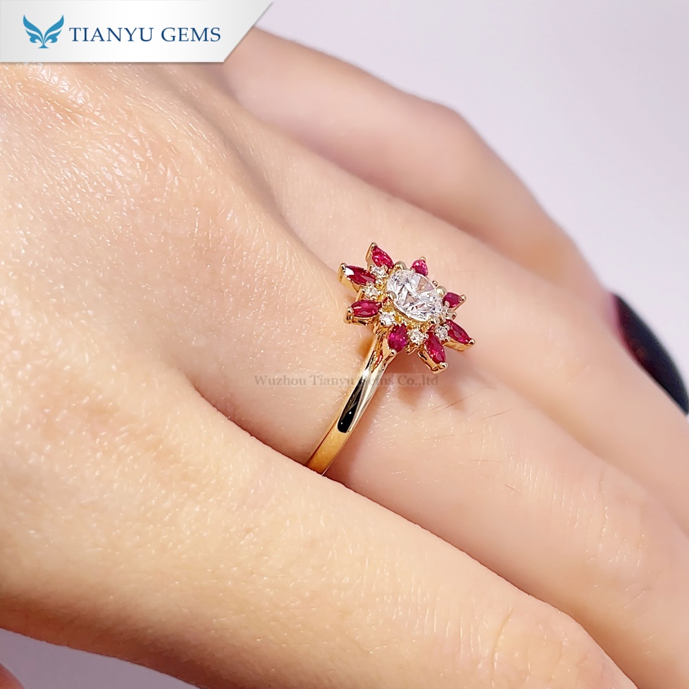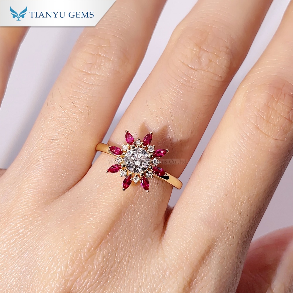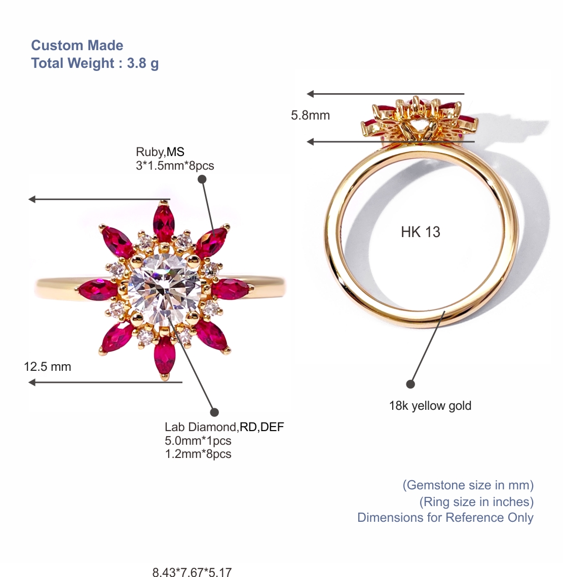 Ringen är utformad som en blomma, har rubinblad och är infattad med en rund labbodlad diamant i mitten. Varje ädelsten är noggrant utvald och polerad för bekvämt bärande.