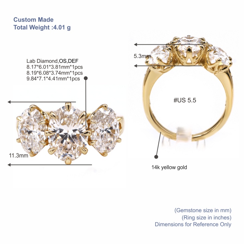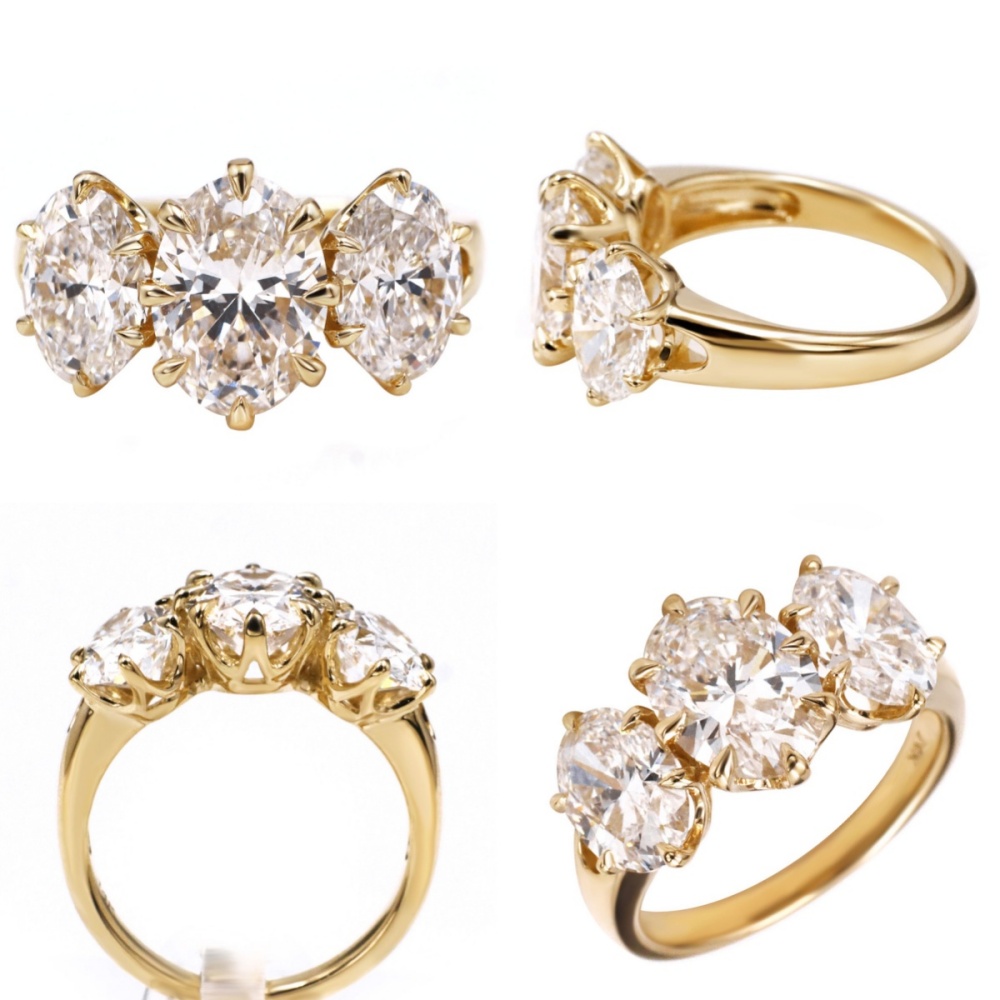 Bland ringarna med tre stenar utmärker sig den ovala mittstenen för sin distinkta karaktär och har vunnit enorm popularitet. Med endast tre enkla, klumpfattade, labbodlade diamanter betonar designen rena linjer och den inneboende skönheten hos labbodlade diamanter, vilket gör den perfekt för vardagsbruk.