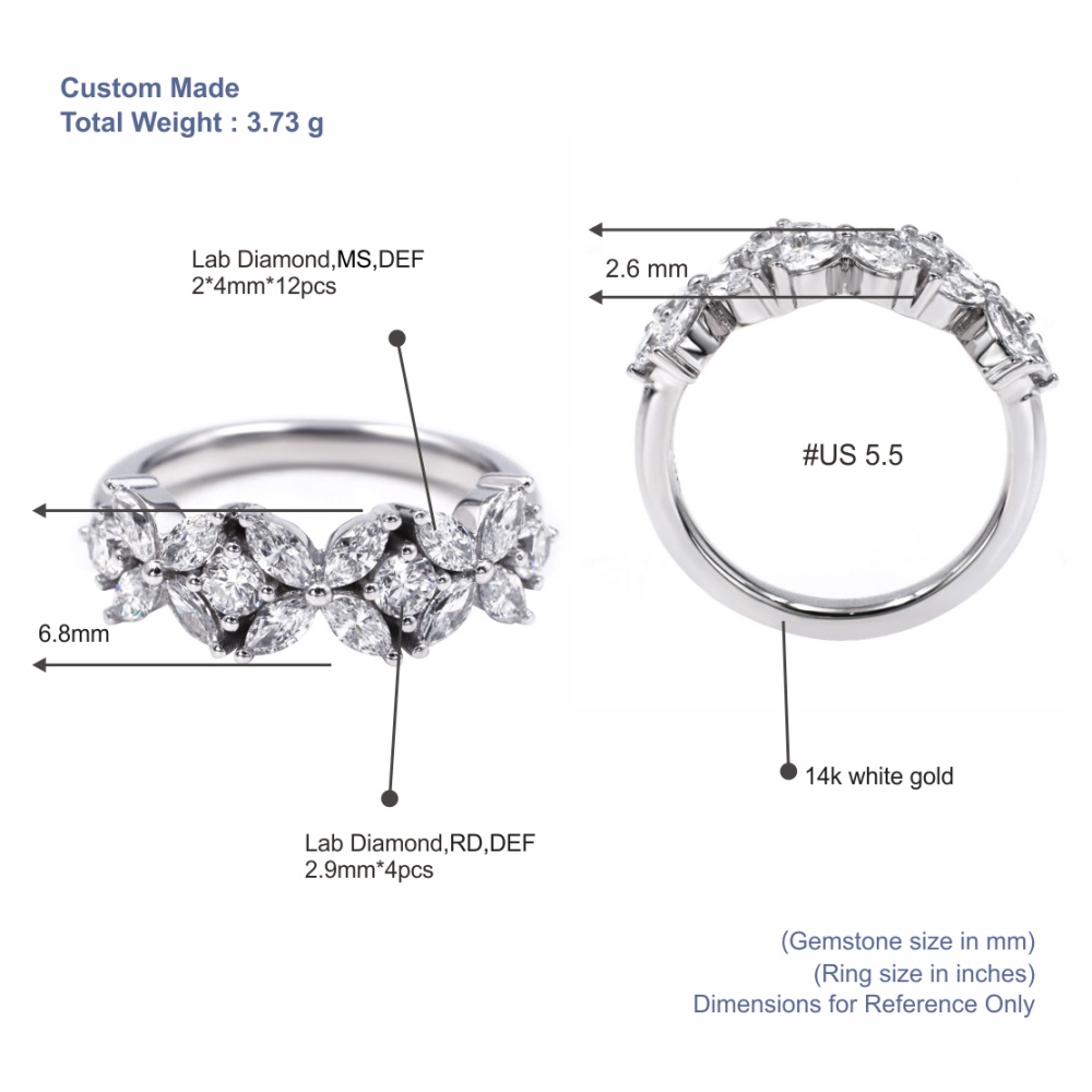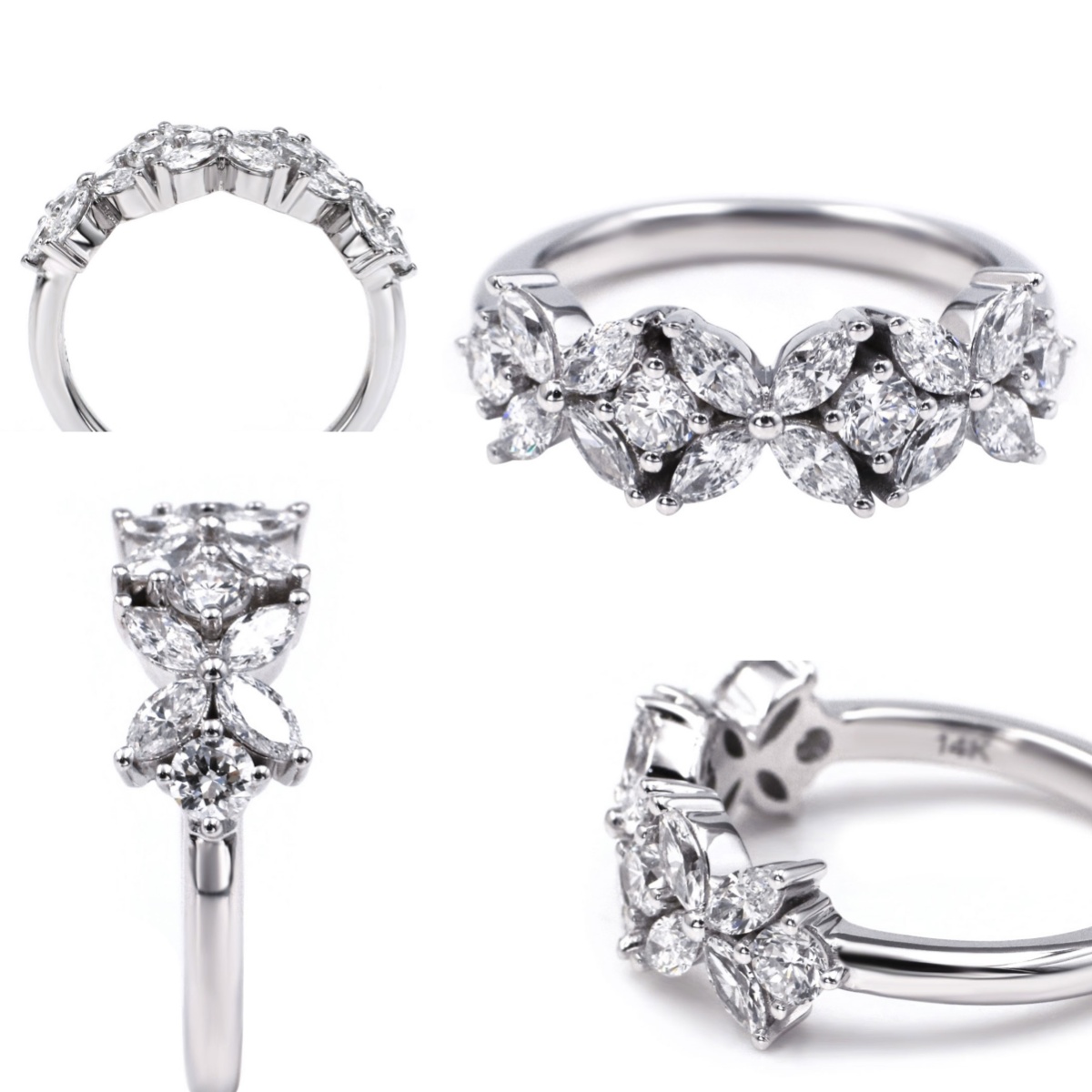 Med en kombination av marquiseslipade och runda labgrown-diamanter är denna ring mer elegant och visuellt slående än traditionella alliansringar.