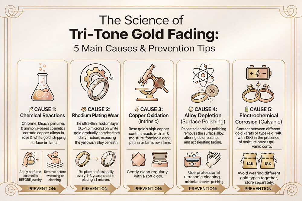 Physical Wear and Tear is the most inevitable factor. Rhodium plating is hard but thin. Daily friction — against clothing, other jewelry, hard surfaces — gradually abrades away the plating on high-contact areas. Once the rhodium layer is breached, the underlying white gold alloy is exposed, and its natural yellowish hue becomes visible, destroying the clean contrast that makes tri-tone gold so visually distinctive.