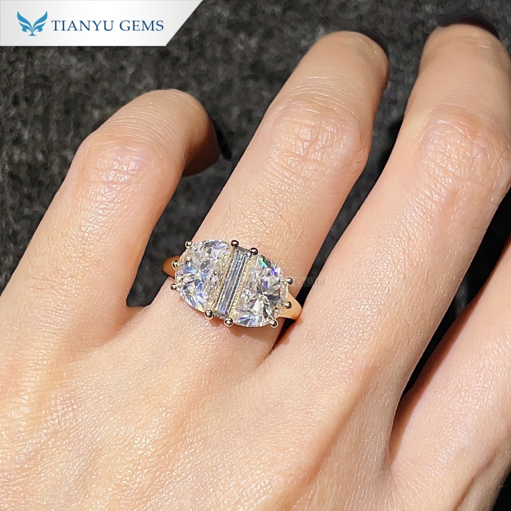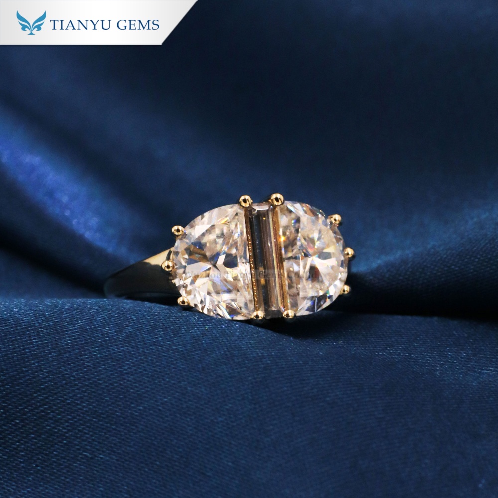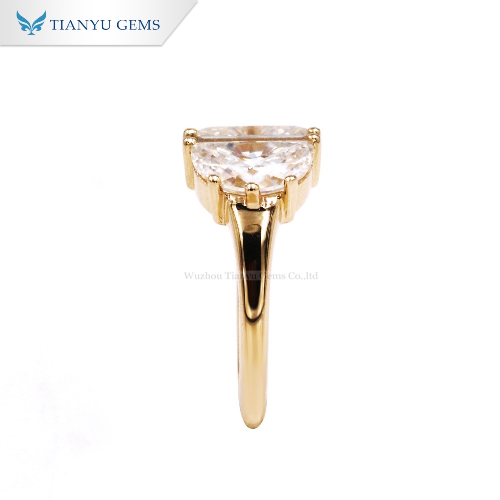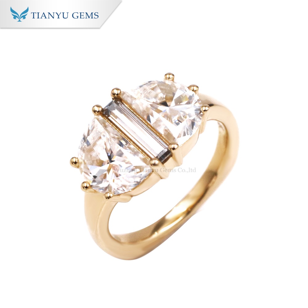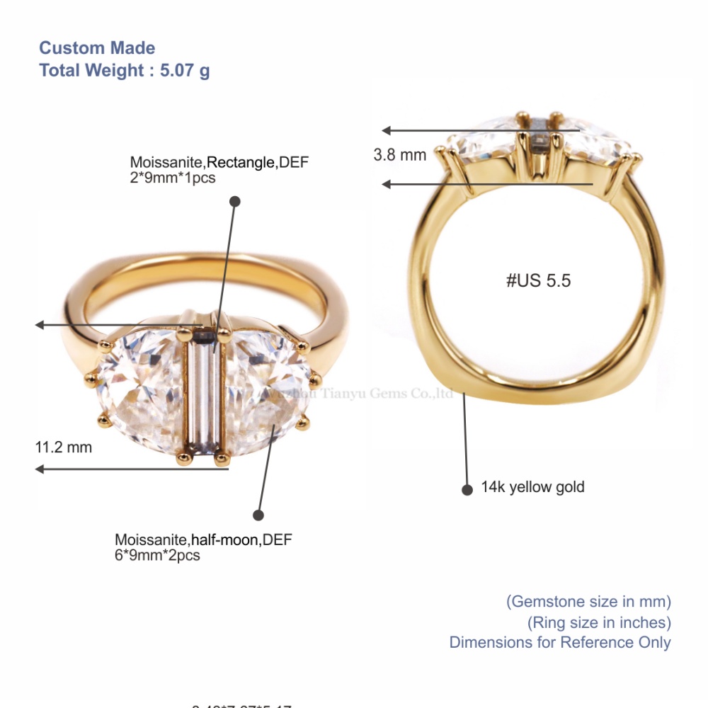 A rectangle-shaped moissanite diamond is set between two half-moon-shaped moissanite diamonds; the entire piece is crafted in 14K gold, combining simplicity with elegance.
