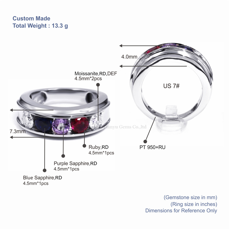 With a collection of three sapphires, red, blue and purple, and two white moissanite diamonds, sparkle and characterize this men's ring!