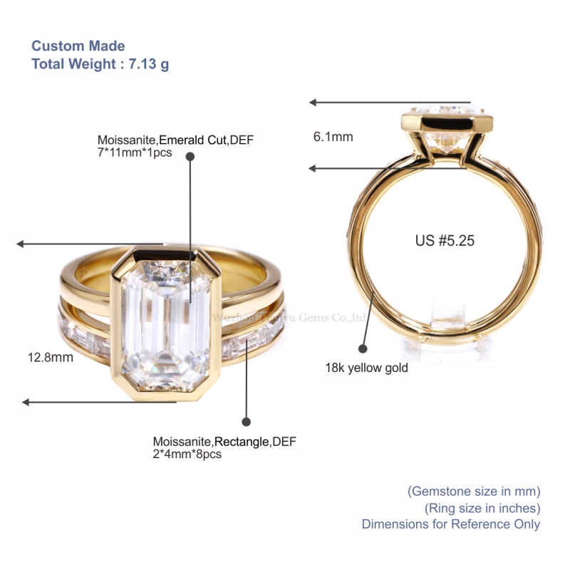 Với thiết kế vành bezel độc đáo, chiếc nhẫn chính được cắt bằng đá moissanite solitaire hình chữ nhật và chiếc nhẫn phụ được đính hai phần ba bằng đá moissanite hình chữ nhật, đây trở thành một phong cách thời trang và thể hiện cảm xúc mới.